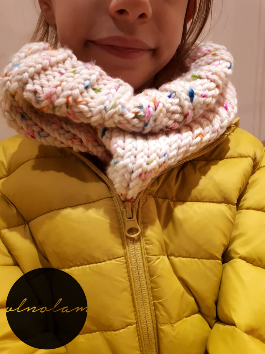 Our first and the most obvious choice was Konfetti yarn – 100% superwash merino. My sister made a snood using this wonderful, very photogenic, warm and soft yarn. Here comes the pattern, please enjoy: